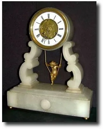 C.1890, French, Swinging Doll, Striking Clock, in generally good condition. Some corners of the alabaster case have been rounded off and there is a hairline in the porcelain dial around 1. This clock is otherwise in very good original condition, the movement clean and running, striking on a bell. Strikers do not occur that often in this format. With Farcot patent double escape wheel and chaff cutter verge. Especially nice detail on cast doll (cherub); note he swings front to back. Height 11 inches Reserve $1000