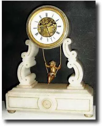 C.1890, French, Swinging Doll, Striking Shelf Clock in a white alabaster case with incised pattern on the front and sides. Has a typical Farcot patent movement, with double escape wheel and "chaff cutter" escapement. This clock came to us from storage, and although it will tick and eek out a strike on the rear bell, it is dirty and would benefit from service. These cases are soft and often in a state of distress, however, this one, other than minor edge chips is in very good order. Doll moves front to back. Height 13" $1000-1500