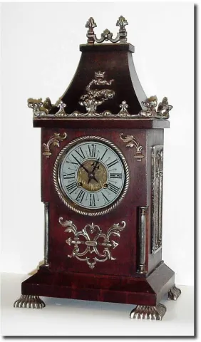C.1890, French, Unusual Mantel Clock, Black walnut with silvered bronze mounts, feet and columns. The silvering is worn through to brass in several places. Most interesting is the pewter dial. The whole clock has a gothic look. Quality Marti movement strikes the hours on a flat wire gong. This clock is consigned by a French lady in New Hamps"r who has given it loving care for the last 25 years. Overall excellent condition; 16'