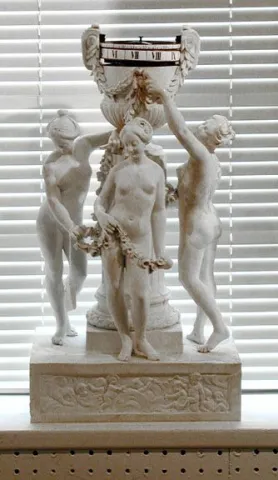 Modeled as three nude maidens holding a floral garland and standing around a column surmounted by an urn with black and white enamel chapter rings, (e...