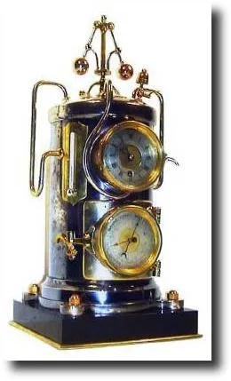 C.1890, French "Vertical Steam Boiler" from the Industrial Series of clocks. The boiler has pipes and gauges, and the 8-day platform clock and aneroid barometer are set in the side of the round boiler. The fly-ball governor at top is driven by a separate movement in the base and runs for several hours on a winding. Both movements are in working order. Note both the clock and the barometer are the same diameter, and the 2 "sisters" to this clock, pictured in Derek Roberts' book: Mystery Novelty and Fantasy Clocks, (1999), pages 263+265, show the clock in the bottom fire box; does not affect the value. Height 14" Reserve $5000