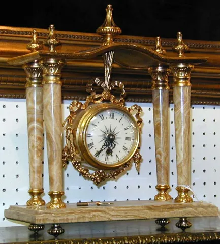 A LOUIS XVI STYLE GILT BRONZE MOUNTED ONYX MANTEL CLOCK.