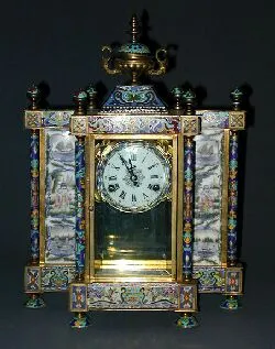 A CHINESE CLOISONNE, PORCELAIN AND BRASS MANTEL CLOCK, 20th century, bearing label 'Made in the People's Republic of China'.