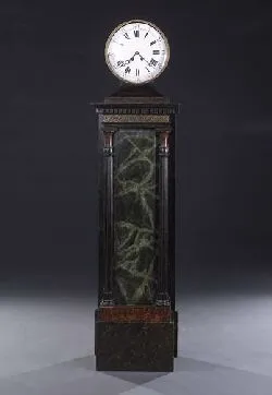 Re-painted, the white enamel dial with Roman numerals and an eight day movement, the simulated marble case with four fluted pilasters, on a plinth bas...