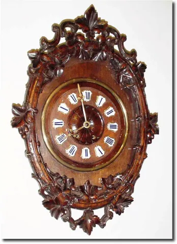 C.1890, French, Walnut cartel clock, the outer branch carved like a bent wood frame, and with ivy leaves all around as accents. The wooden dial has 12 porcelain cartouche, each on a gilt brass shield, and with gilt club hands. The movement ticks and strikes and the condition is very good. Height 24.5