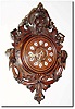 C.1890, French, Walnut cartel clock with carved lion at top and ribbons and scrolls at the bottom. The dial has 12 enamel cartouche, with black numerals, the VI is repaired. The clock ticks and strikes on a gong. Very nice carving; Height 26'