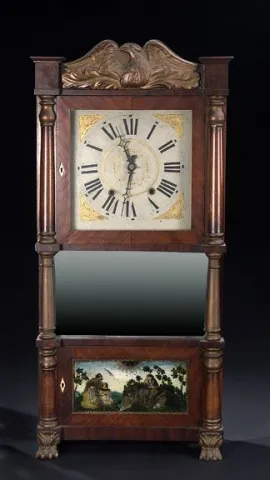 Carved eagle cresting above glazed door opening to white painted wood dial embellished with gilding, over a recessed mirrored plate and second glazed ...
