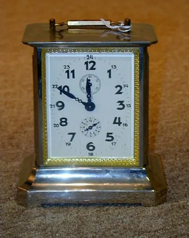 the rectangular clock face with two subsidiary dials in a conforming case with beveled glass and brass bail handle, on a bracket base, 5 3/4 in. high ...
