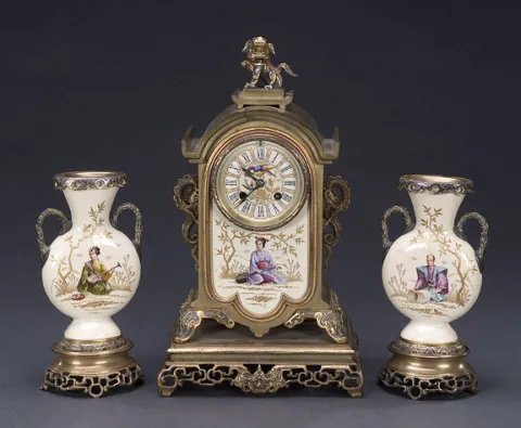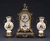 AN AESTHETIC MOVEMENT POLYCHROME-GILT BRONZE MOUNTED ENGLISH POTTERY CLOCK GARNITURE, Late 19th century, retailer's mark for J.E. Caldwell & Co., Philadelphia, no. 10793.