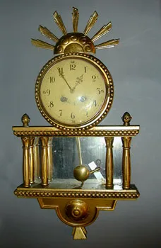The circular cream painted clock face within a drum case above a colonnaded mirrored lower shelf etched with beads, the whole surmounted by a demi sun...