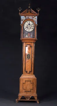 A DUTCH CLASSICAL INLAID AND PARCEL-GILT ELMWOOD AND PART-EBONISED LONGCASE CLOCK, early 19th century.