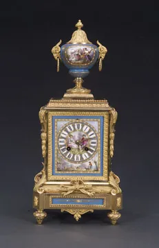 AN ORMOLU-MOUNTED 'SEVRES' PORCELAIN MANTEL CLOCK, 19th century, works stamped 'B.R.'/271/38100' and plinth stamped '38100' at back.