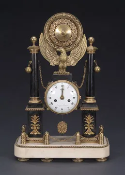 Four-inch enamel dial with black Roman and Arabic numerals, bell striking circular movement, pendulum with Medusa head weight, the clock flanked by tw...