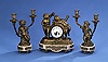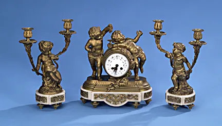 A LOUIS XV STYLE GILT BRONZE AND MARBLE THREE-PIECE CLOCK GARNITURE, late 19th century, after Clodion, the works stamped, 'SH Paris'.