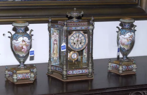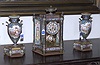 A LOUIS XVI STYLE GILT-BRONZE MOUNTED PORCELAIN, CHAMPLEVE AND 'JEWELED' THREE PIECE CLOCK GARNITURE, The works stamped Japy Freres.