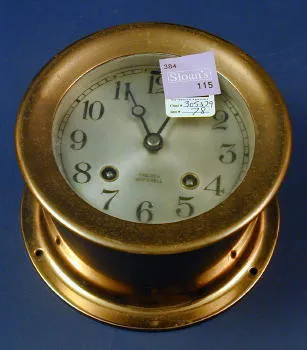 A BRASS CASED SHIPS BELL CLOCK Labeled Chelsea, England.
