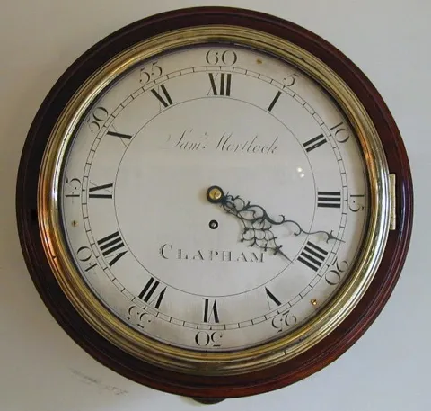 The 12" silvered dial with Roman numerals and Arabic five minute markings. Signed Samuel Mortlock Clapham, with glazed brass concave section bezel. Th...