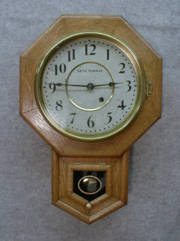 SETH THOMAS OAK 10" SHORT DROP SCHOOL CLOCK. CIRCA 1920'S.