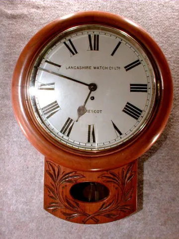 THE CASE IS MAHOGANY WITH CARVING AROUND THE LOWER GLASS. THE PAINTED ROMAN DIAL IS SIGNED "LANSHIRE WATCH CO., Ltd. PRESCOT". THIS 8 DAY TIMEPIECE IS...