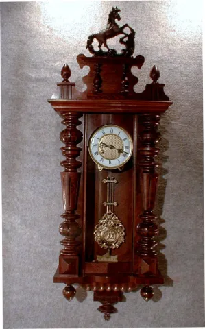 THE CASE IS OF LINDENWOOD AND WALNUT VENEERS IN A DARK WALNUT FINISH. THE TOP IS ORIGINAL, AS IS THE CAST HORSE ON TOP. THE DIAL HAS A BRASS CENTER WI...