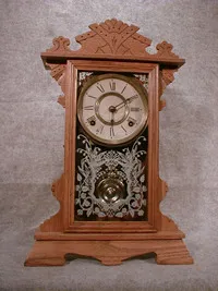 THE PAPER DIAL HAS ROMAN NUMERALS WITH NICKLE TRIM, THE PENDULUM IS ALSO NICKLE. THE 8 DAY MOVEMENT STRIKES THE HOURS AND 1/2 HOURS ON A GONG. 20 1/2"...