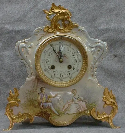 PAINTING BY PETIT OF A COUPLE ON A BENCH. BLUE MOTIF W/RAISED GILT FLOWER ON SIDES. GILT MOUNTING ON CROWN AND FEET. PORCELAIN DIAL WITH PAINTED CUPID...
