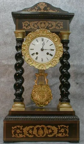 WITH SATINWOOD MARQUETRY WITH BARLEY TWIST COLUMNS THAT HAVE GILT CAPS AND BASES. PORCELAIN DIAL WITH ROMAN NUMERALS. 8 DAY MOVEMENT MARKED "ROLLIN A ...