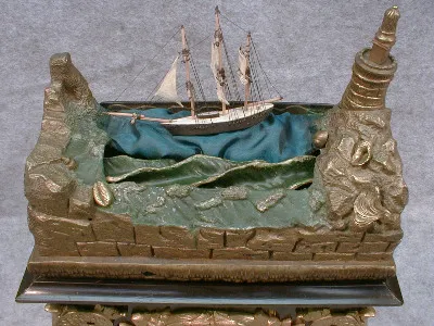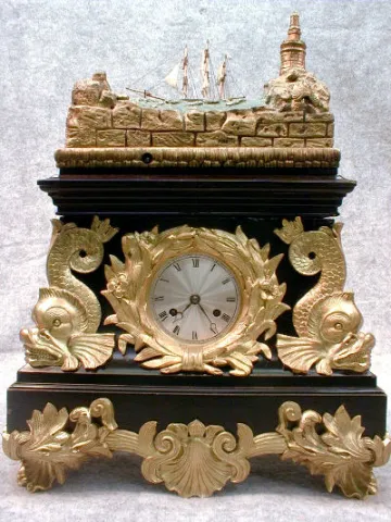 THIS IS A FRENCH AUTOMATON ROCKING SHIP MANTEL CLOCK IN AN EBONISED WOOD CASE. CIRCA 1810-1825.