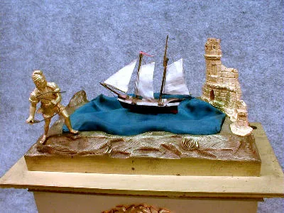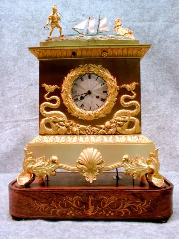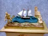 THIS IS A FRENCH AUTOMATON ROCKING SHIP MANTEL CLOCK IN A GILT CASE CIRCA 1810-1825.