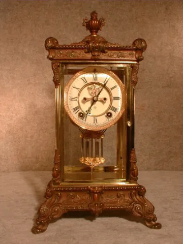 THE CAST CASE TOP AND BASE ARE FINISHED IN SYRIAN BRONZE, AND THE BALANCE OF THE CASE IS POLISHED BRASS WITH BEVELED GLASS ALL AROUND. THE DIAL IS POR...