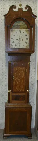 ARCHED DIAL WITH HUNTING SCENE, FLORAL CORNERS, ROMAN NUMERALS, SECONDS BIT AND MOUTH STYLE CALENDAR APERTURE. OAK CASE WITH MAHOGANY TRIM, SHELL INLA...