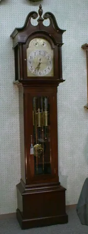IMPORTED BY BAWO & DOTTER, NYC. THIS IS A DOMESTIC MAHOGANY CASE WITH A SWAN NECK PEDIMENT WITH A FLAME WOOD FINIAL IN THE CENTER. THERE ARE 2 FULL CO...