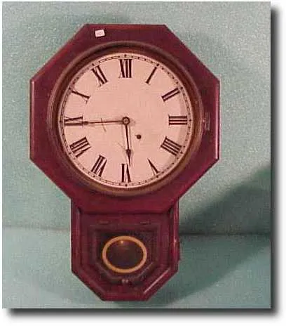 8 day, strikes a nickel bell. Brass bob cleaned, now copper colored, brass bezel. Clock is original, clean, running. 38 inch walnut case. Ly-Welch, pa...