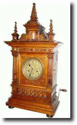 movement in a walnut architectural case, roof and steeple with carved "shingles". The large double fusee movement is well made, with heavy brass plates, and with count wheel at top of the back plate. In the base of the case is the original 6 tune music box wound with a hand crank on the right side of the case. It appears that at one time the music may have played automatically after the cuckoo, however, at this time it operates manually. The original tune sheet is intact and fully legible. Original cuckoo flutes are intact as well, with some repairs, and they have a nice deep tone. This clock has gotten separated from its pendulum, and this will need to be made, and the bezel and crystal over the dial are missing. Music box plays and with no broken teeth, but will need attention. Clock is otherwise complete and sound. Height 31 inches $2000-2500