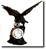 C.1890, Swiss, 8-day, pin set clock, with eagle stand. The eagle shows evidence of repairs, but is now intact and has been re-bronzed. Note the eagles wings are removable (held on with screws), and the eagles legs have stubs that fit down into the tree-trunk base which has the talons cast in. The over-grown watch movement is a stem wind job, with rear access through a large hinged cover. The nickeled case is mostly worn to brass. Porcelain dial is perfect. Runs. Diam. of case 3.8", Height of eagle, 15" Should attract a lot of attention at $200-300