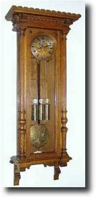 C.1895, Austian, 3-Weight Grand Sonnerie wall clock in a quality custom case, our guess made to match the owners furniture at the time. The case is very well made with a dentil molding top, and inset panel in the back with a finely carved pattern. The well made movement is singed Alois Sulz, in Wien (on dial), and with engraved dial center, pendulum and weights. Note the gilding has been polished off of the weights. Case stabilizers intact as well. Although not your traditional style, this clock should attract attention; height 47" $1750-2250