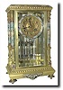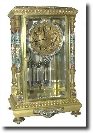 with 4 full standing columns, each decorated with cloisonne' enamel in red, white, blue and aqua, and the dial surround and mercury-vial pendulum, as well as the top molding, base shield and 4 button feet with matching enameling. The quality round French movement is numbered 3940-411 and retains original hands. The gilt dial has some oxidation spots and some of the painted numerals are partially rubbed away. Still, this is a well made and attractive clock in good running order. Height 11 inches Reserve $1000