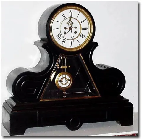 This clock came from storage and is dirty, however is in good condition and will clean up nicely. Retains original Ellicott style pendulum and good porcelain dial with original moon hands. The F/S rod through the dial is missing, a common omission by frustrated repairmen. (will function without this rod) Front beveled glass in leaded brass frame. Minor edge nicks in marble; NO shipping. Height 20.4'