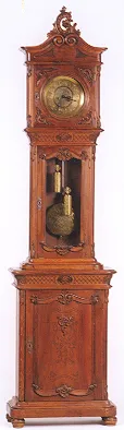 the two-section Louis XV style walnut case decorated with foliate carving and incised lines, the signed Gustav Becker movement behind an ornate brass ...