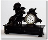 There is something missing from his hands, possibly a bow, and inspection shows where it was attached. Moreover, the bottom molding of the marble base is missing, and there is now a piece of plywood, painted black, with 4 turned bun feet. A French bell strike movement is mounted in the urn to the right, surmounted by an acanthus wreath and a torch. Runs. A decorator; height 12'