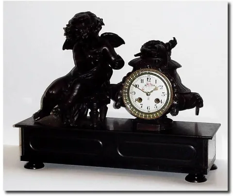C.1895, French, Patinated Spelter, Figural clock of a large winged cherub.