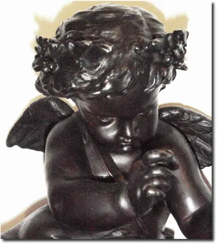 C.1895, French, Patinated Spelter, Figural clock of a large winged cherub. There is something missing from his hands, possibly a bow, and inspection shows where it was attached. Moreover, the bottom molding of the marble base is missing, and there is now a piece of plywood, painted black, with 4 turned bun feet. A French bell strike movement is mounted in the urn to the right, surmounted by an acanthus wreath and a torch. Runs. A decorator; height 12'