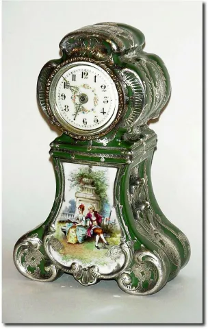 This is a very pleasant clock, the hand painted scene of two lovers in the garden signed "A.G.', and the front sides, top a rear profusely covered with fine silver that has been engraved with intricate patterns. Minor wear here and there but overall excellent; fancy porcelain dial with floral wreath center. Time only, platform movement runs fine; takes a long shaft no. 2 key to wind and the no. 3 with it is a bit loose; Height 8.5'