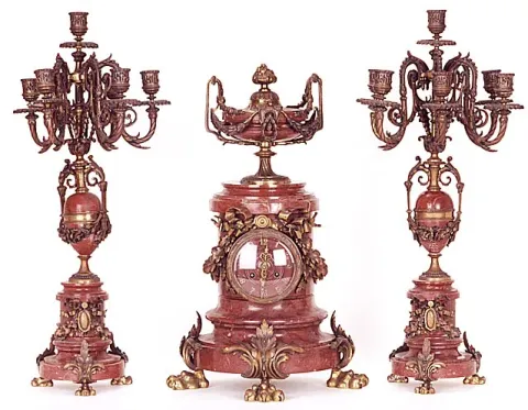 A FRENCH BRONZE AND RED MARBLE CLOCK GARNITURE; mid-19th century, clock by Barrard & Vignon,