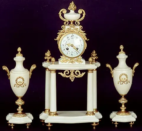gilt bronze clock case and fittings on white marble columned base and pair of urn form garnitures; key wound, time and strike, hand painted porcelain ...