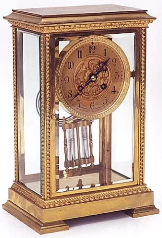 with rectangular brass, gilt-bronze and beveled glass case; the round springwound movement striking the hour and the half on coil resonator; face and ...