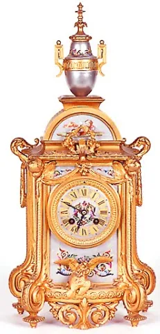the hand enameled porcelain insets have silver painted fields matching the enameled silvered dial. Garlands, masks, birds and silvered vasiform crest ...