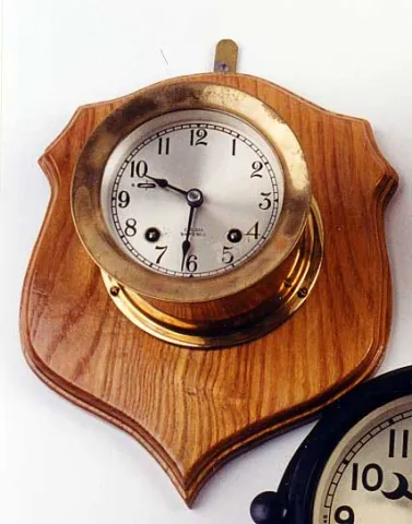 the heavy brass deep case having time and bell strike, with key on shaped hardwood wall mount. Diameter 4 3/4 inches, depth 3 3/8 inches...