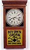 pressed oak case with painted glass window advertising "My Own Cigar 5c"; having 30 day wind/strike movement. Height 33 1/2 inches...