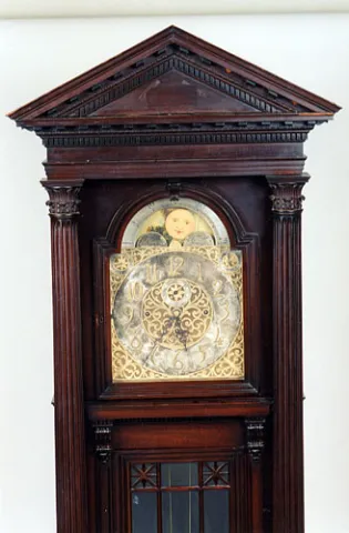 the classic architectural mahogany case housing a 3-weight movement that chimes on 9 visible metal tubes, the ornate silvered dial with gold roman num...